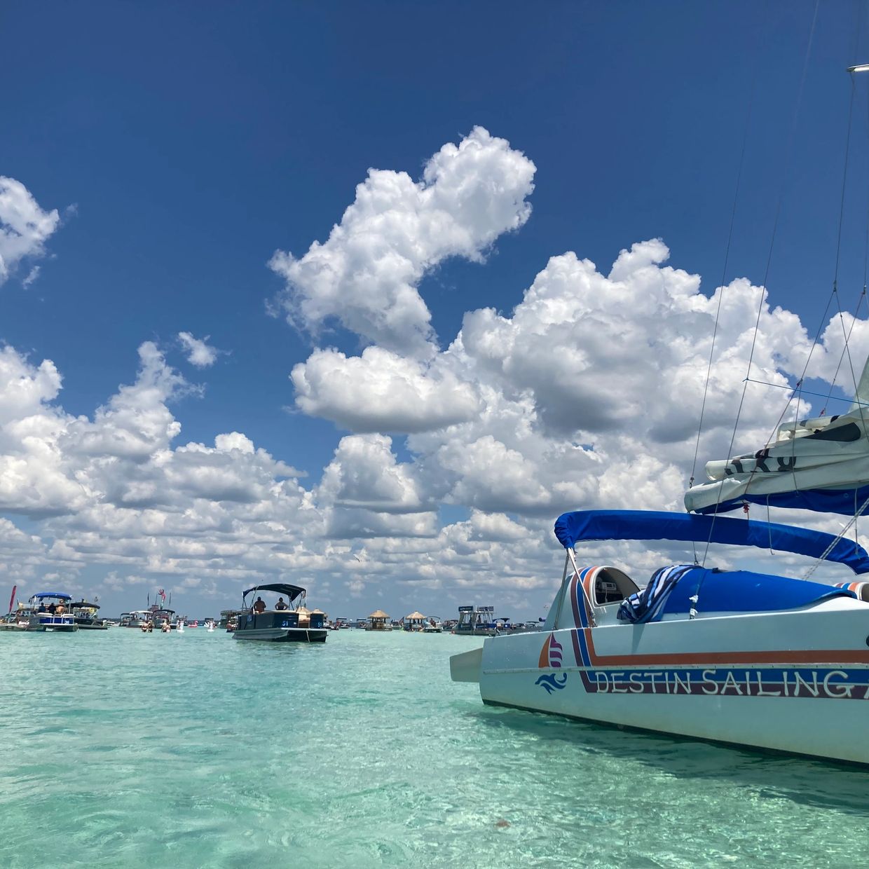 The spot everyone wants to see while visiting Destin Florida is Crab Island! One of the more popular sailing catamaran adventures and a great spot to drink a few, have lunch, swim or just take it all in. They have food, ice cream, boiled peanuts and T-Shirts available just about everyday rain or shine.